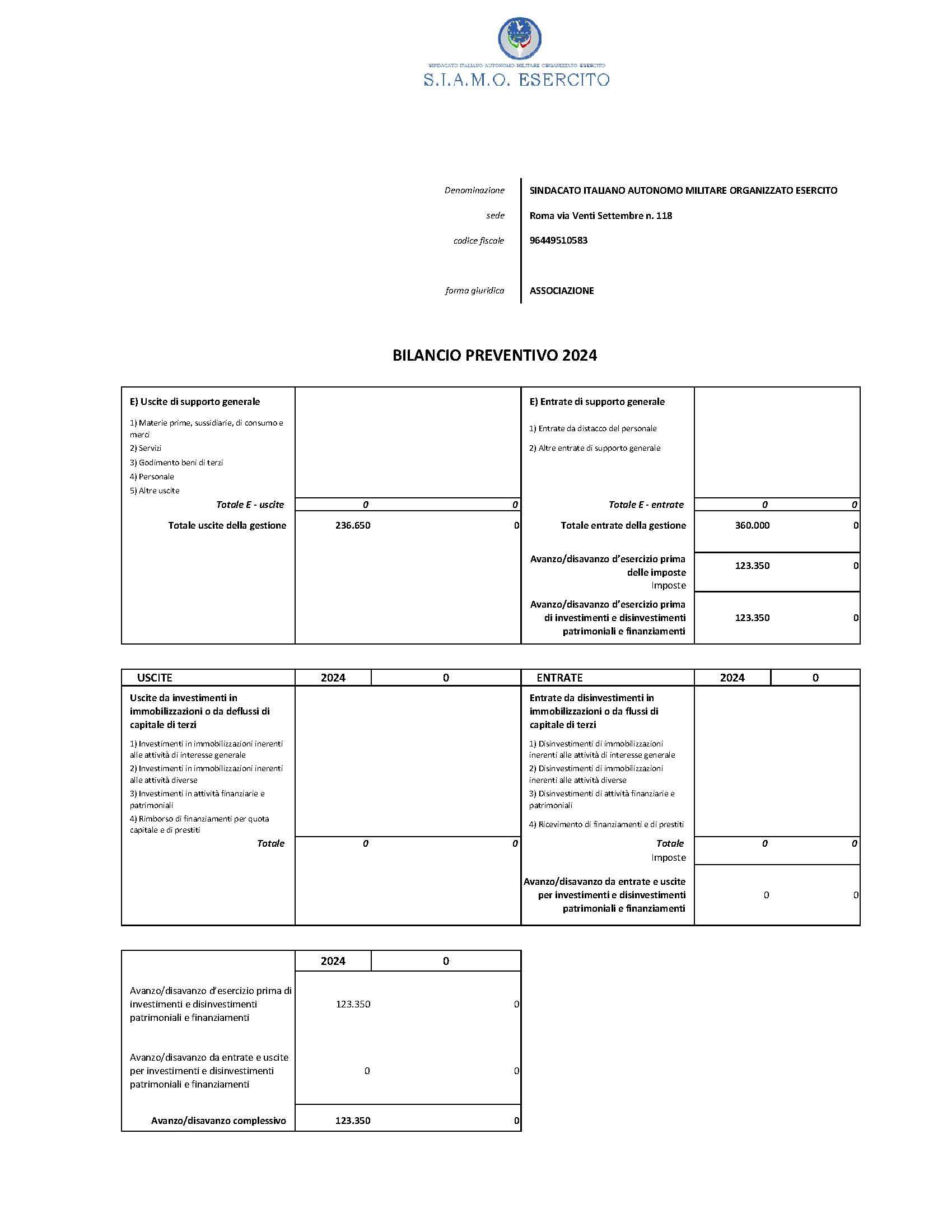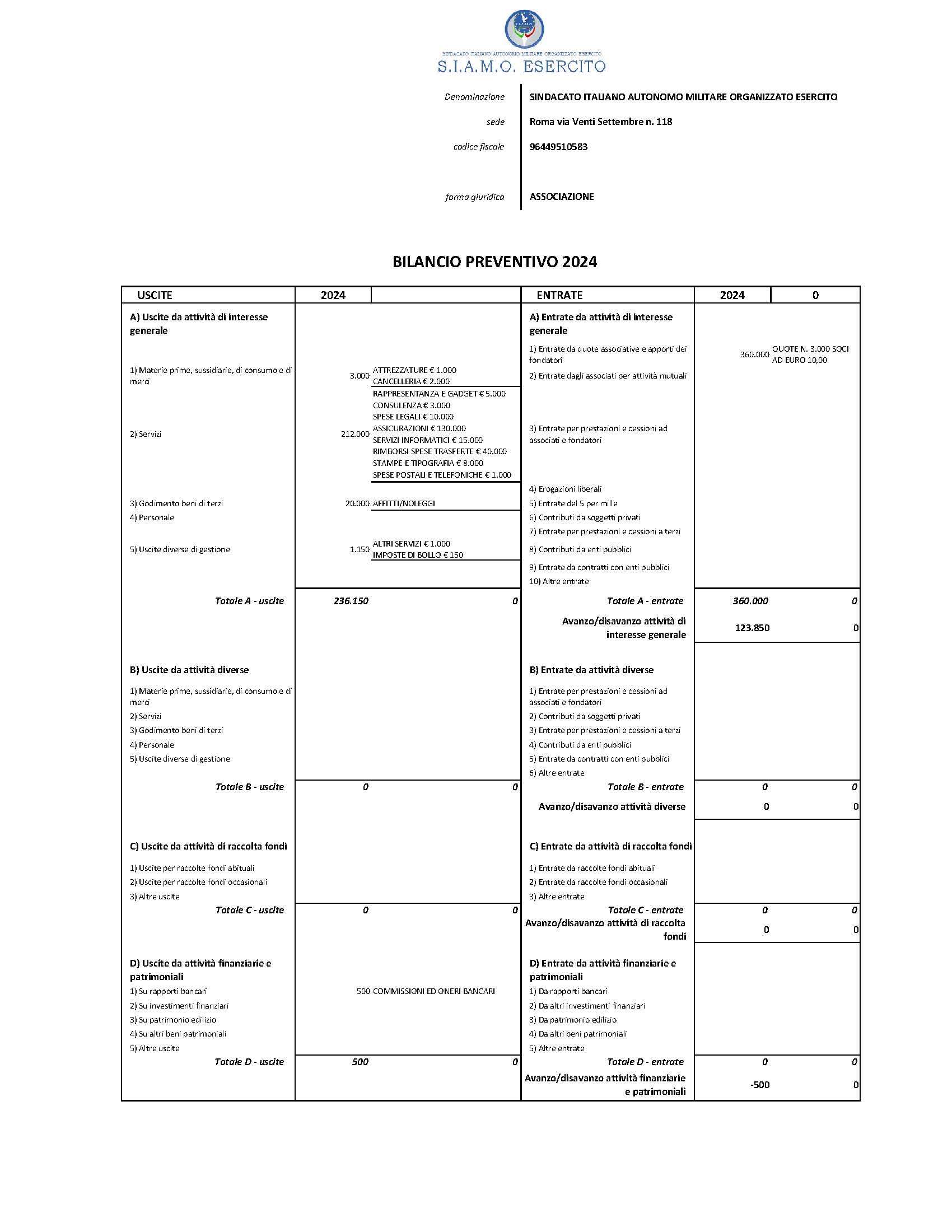 Il Bilancio preventivo di gestione dell’esercizio, così come previsto dallo statuto del SIAMO ESERCITO e in ossequio all’articolo 7 della Legge 28 aprile 2022 , n. 46 “Norme sull’esercizio della libertà sindacale del personale delle Forze armate e delle Forze di polizia a ordinamento militare, nonché delega al Governo per il coordinamento normativo” è stato predisposto ricalcando, ove pertinenti o per quanto non espressamente indicato, gli articoli 2423 bis e seguenti del Codice Civile in tema di bilancio di esercizio.